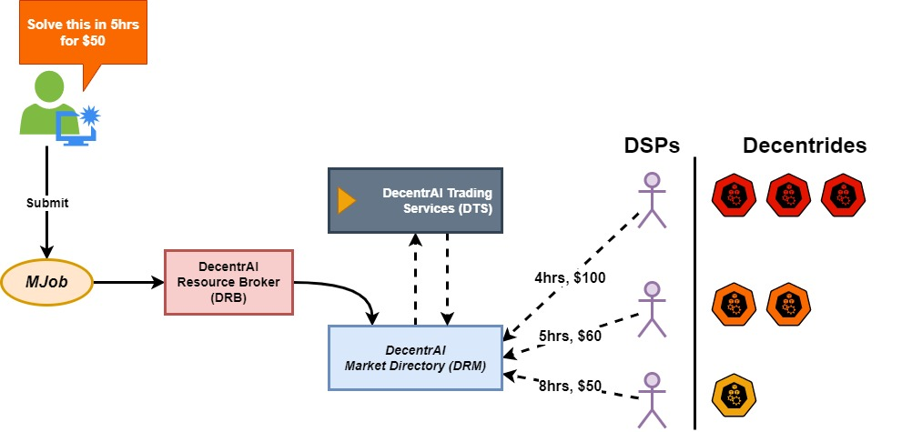 1. DecentrAI User (DU): DU is fundamentally a consumer who will submit a high- performance computing or AI job to the platform. A DU is required to deposit a certain minimum amount so that the submitted job can be executed on the platform.