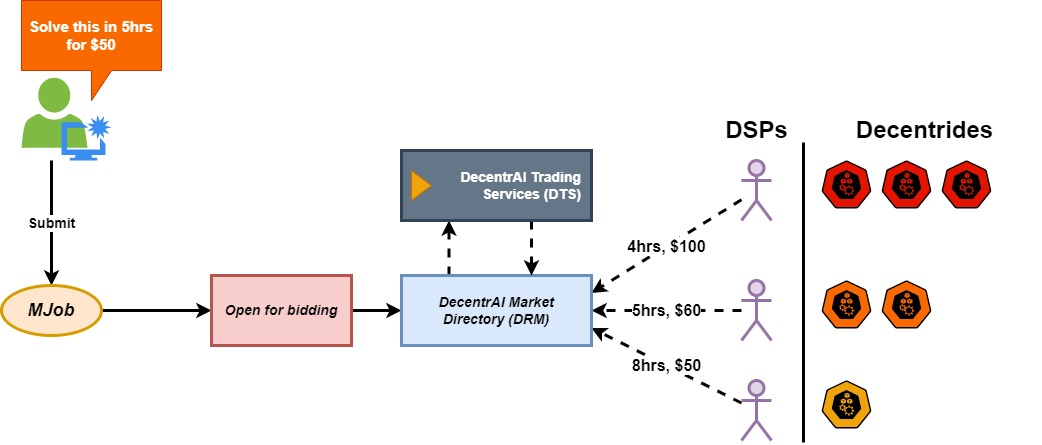 2. **DecentrAI Service Providers (DSP):** DecentrAI service providers are basically another type of user offering their computational power for decentralized model training, testing, and job execution services. A DSP can consists of a single decentride or a cluster of decentrides on the DecentrAI platform. A decentride is an end node on the DecentrAI platform that is responsible for the execution of an actual job.